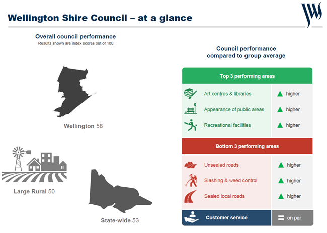 Importantly, Wellington Shire Council continues to perform at or above the levels of both the Large Rural Council group and the State-wide averages across all core measures and most individual service areas assessed. This represents a strong and positive outcome for Council.
