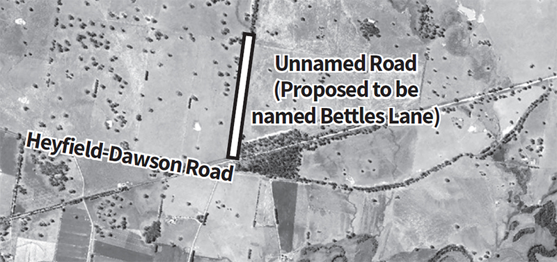 The proposed name is Bettles Lane, named after Roy Scott Bettles who worked as a blacksmith in Heyfield before enlisting for the Armed Forces on 25 August 1915.